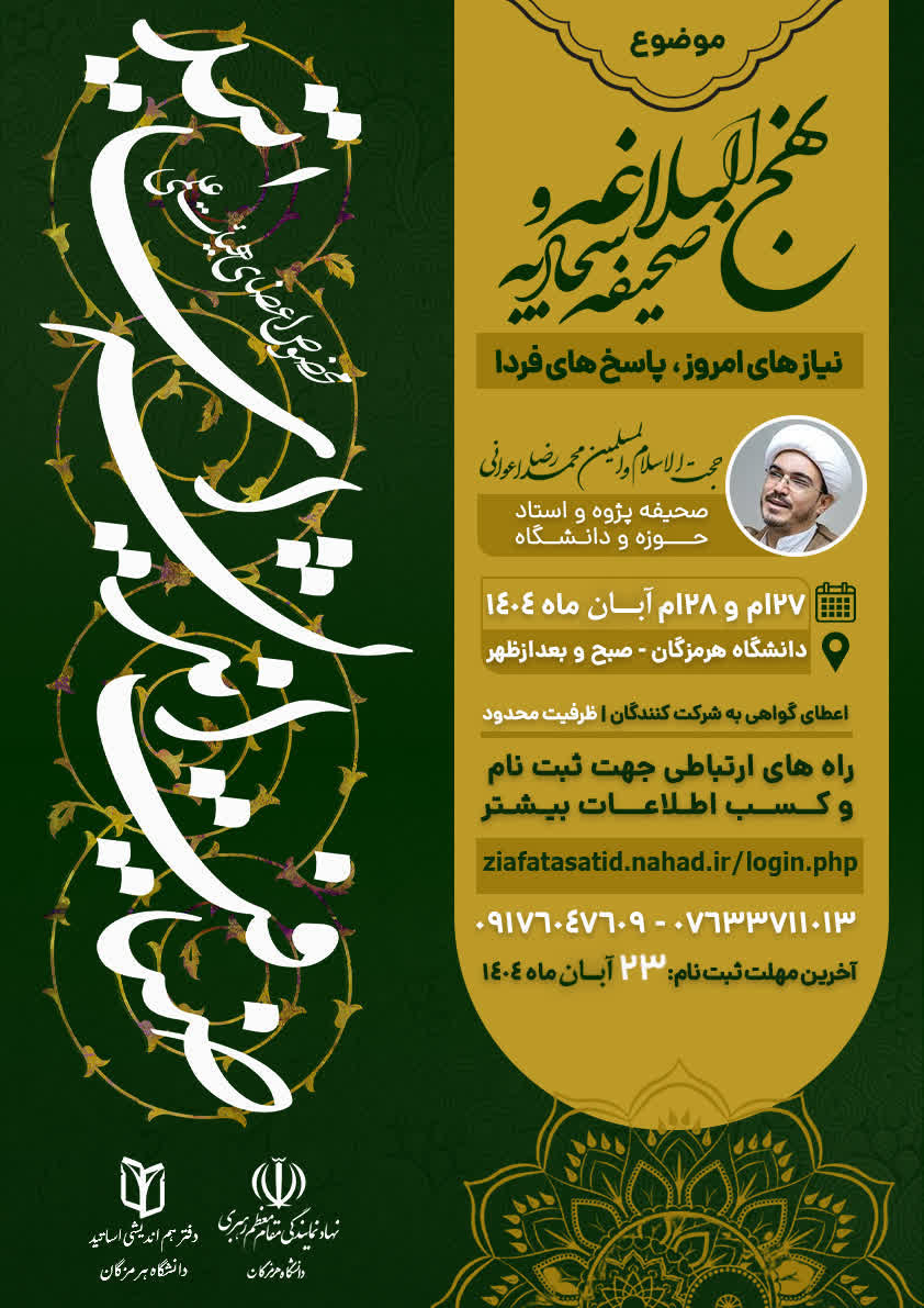 ضیافت‌ اندیشه‌ اساتید‌ «نهج‌ البلاغه‌ و‌ صحیفه‌ سجادیه‌،‌‌ نیازهای امروز‌، پاسخ‌های‌فردا» وب‌سایت رسمی دانشگاه در روز 7 تیرماه، هدف حمله شدید و سازمان‌یافته DDOS از سوی عوامل معاند و گروه‌های صهیونیستی قرار گرفت بیانیه دفتر هم اندیشی دانشگاه هرمزگان پیرو شهادت سرکار خانم دکتر مهسا احمری همکار مدعو گروه روانشناسی دانشگاه هرمزگان «کُلُّ یَومٍ عاشورا و کُلُّ أرضٍ کَربَلا» (همه روز‌ها عاشورا و همه زمین‌ها کربلاست) «صمت انقلاب» روایتی گمشده از قلب پیشرفت استان هرمزگان آغاز ثبت‌نام اعتکاف دانشگاهیان 1403 طرح حامیم بستر و راهی برای جهت دهی و سرعت بخشی به دانشجویان دانشجو، زبان امت برای دولت آئین افتتاحیه حامیم 4 دانشگاه هرمزگان/ دانشگاه‌های استان هرمزگان پیشتاز حامیم 4 در کشور آغاز ثبت نام طرح اندیشه تمدن ساز ثبت نام چهارمین دوره توانمند سازی دانشجویان فعال فرهنگی، سیاسی و اجتماعی دانشجویان دانشگاه هرمزگان(حامیم 4) تداوم طرح حامیم در دانشگاه هرمزگان تجمع دانشگاهیان دانشگاه هرمزگان در محکومیت جنایات رژیم صهیونسیتی در لبنان کسب عنوان ایده برتر توسط دانشجویان دانشگاه هرمزگان مرحله استانی طرح حامیم در مشهد مقدس برگزار می‌شود نماز در سیره و سخن امام سجاد (علیه السلام) از تبیین تا قیام ایران قوی؛ جمهوری اسلامی سرافراز جلسه تبیینی انتخابات در مجتمع آموزش عالی میناب جلسه انتخاباتی با موضوع مشارکت حداکثری و انتخاب اصلح مراسم سوگواری شهدای خدمت در دانشگاه هرمزگان